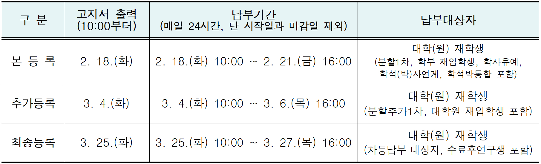 2025학년도 1학기 재학생 등록금 납부계획을 다음과 같이 알려드립니다. 등록금 납부에 차질이 없도록 기한내 납부하시기 바랍니다.