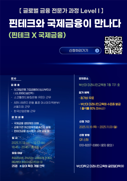 fnctId=bbs,fnctNo=2186 작성일 2025.10.17 수정일 2025.10.17 작성자 치전원 관리자 조회수 9 [미래시민교육원] 글로벌금융전문가과정 Level1 핀테크와 국제 금융이 만나다 첨부파일 첨부파일이(가) 없습니다.